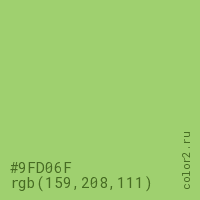 Цвет #9FD06F в цветовой модели RGB обозначается тремя октетами (159, 208, 111) в десятичном формате и #9FD06F в шестнадцатиричном (hex) формате, которые являются интенсивностью красного 159 (hex 9F), интенсивность зелёного 208 (hex D0) и интенсивность синего 111 (hex 6F).
