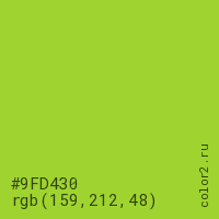 Цвет #9FD430 в цветовой модели RGB обозначается тремя октетами (159, 212, 48) в десятичном формате и #9FD430 в шестнадцатиричном (hex) формате, которые являются интенсивностью красного 159 (hex 9F), интенсивность зелёного 212 (hex D4) и интенсивность синего 48 (hex 30).