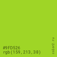 Цвет #9FD526 в цветовой модели RGB обозначается тремя октетами (159, 213, 38) в десятичном формате и #9FD526 в шестнадцатиричном (hex) формате, которые являются интенсивностью красного 159 (hex 9F), интенсивность зелёного 213 (hex D5) и интенсивность синего 38 (hex 26).