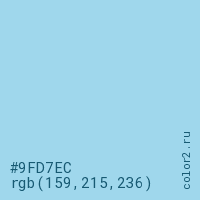 Цвет #9FD7EC в цветовой модели RGB обозначается тремя октетами (159, 215, 236) в десятичном формате и #9FD7EC в шестнадцатиричном (hex) формате, которые являются интенсивностью красного 159 (hex 9F), интенсивность зелёного 215 (hex D7) и интенсивность синего 236 (hex EC).