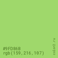 Цвет #9FD86B в цветовой модели RGB обозначается тремя октетами (159, 216, 107) в десятичном формате и #9FD86B в шестнадцатиричном (hex) формате, которые являются интенсивностью красного 159 (hex 9F), интенсивность зелёного 216 (hex D8) и интенсивность синего 107 (hex 6B).