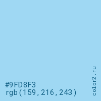 Цвет #9FD8F3 в цветовой модели RGB обозначается тремя октетами (159, 216, 243) в десятичном формате и #9FD8F3 в шестнадцатиричном (hex) формате, которые являются интенсивностью красного 159 (hex 9F), интенсивность зелёного 216 (hex D8) и интенсивность синего 243 (hex F3).