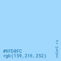 Цвет #9FD8FC в цветовой модели RGB обозначается тремя октетами (159, 216, 252) в десятичном формате и #9FD8FC в шестнадцатиричном (hex) формате, которые являются интенсивностью красного 159 (hex 9F), интенсивность зелёного 216 (hex D8) и интенсивность синего 252 (hex FC).