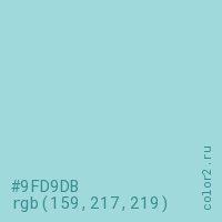 Цвет #9FD9DB в цветовой модели RGB обозначается тремя октетами (159, 217, 219) в десятичном формате и #9FD9DB в шестнадцатиричном (hex) формате, которые являются интенсивностью красного 159 (hex 9F), интенсивность зелёного 217 (hex D9) и интенсивность синего 219 (hex DB).