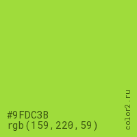 Цвет #9FDC3B в цветовой модели RGB обозначается тремя октетами (159, 220, 59) в десятичном формате и #9FDC3B в шестнадцатиричном (hex) формате, которые являются интенсивностью красного 159 (hex 9F), интенсивность зелёного 220 (hex DC) и интенсивность синего 59 (hex 3B).