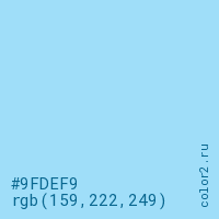Цвет #9FDEF9 в цветовой модели RGB обозначается тремя октетами (159, 222, 249) в десятичном формате и #9FDEF9 в шестнадцатиричном (hex) формате, которые являются интенсивностью красного 159 (hex 9F), интенсивность зелёного 222 (hex DE) и интенсивность синего 249 (hex F9).