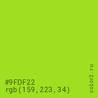 Цвет #9FDF22 в цветовой модели RGB обозначается тремя октетами (159, 223, 34) в десятичном формате и #9FDF22 в шестнадцатиричном (hex) формате, которые являются интенсивностью красного 159 (hex 9F), интенсивность зелёного 223 (hex DF) и интенсивность синего 34 (hex 22).