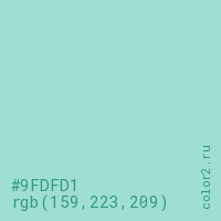 Цвет #9FDFD1 в цветовой модели RGB обозначается тремя октетами (159, 223, 209) в десятичном формате и #9FDFD1 в шестнадцатиричном (hex) формате, которые являются интенсивностью красного 159 (hex 9F), интенсивность зелёного 223 (hex DF) и интенсивность синего 209 (hex D1).