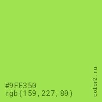 Цвет #9FE350 в цветовой модели RGB обозначается тремя октетами (159, 227, 80) в десятичном формате и #9FE350 в шестнадцатиричном (hex) формате, которые являются интенсивностью красного 159 (hex 9F), интенсивность зелёного 227 (hex E3) и интенсивность синего 80 (hex 50).