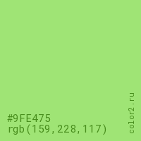 Цвет #9FE475 в цветовой модели RGB обозначается тремя октетами (159, 228, 117) в десятичном формате и #9FE475 в шестнадцатиричном (hex) формате, которые являются интенсивностью красного 159 (hex 9F), интенсивность зелёного 228 (hex E4) и интенсивность синего 117 (hex 75).