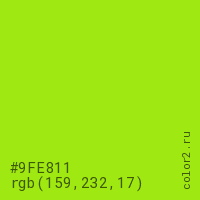 Цвет #9FE811 в цветовой модели RGB обозначается тремя октетами (159, 232, 17) в десятичном формате и #9FE811 в шестнадцатиричном (hex) формате, которые являются интенсивностью красного 159 (hex 9F), интенсивность зелёного 232 (hex E8) и интенсивность синего 17 (hex 11).