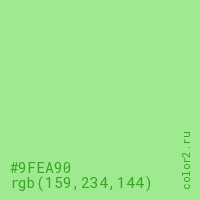 Цвет #9FEA90 в цветовой модели RGB обозначается тремя октетами (159, 234, 144) в десятичном формате и #9FEA90 в шестнадцатиричном (hex) формате, которые являются интенсивностью красного 159 (hex 9F), интенсивность зелёного 234 (hex EA) и интенсивность синего 144 (hex 90).