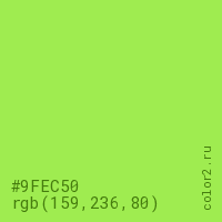 Цвет #9FEC50 в цветовой модели RGB обозначается тремя октетами (159, 236, 80) в десятичном формате и #9FEC50 в шестнадцатиричном (hex) формате, которые являются интенсивностью красного 159 (hex 9F), интенсивность зелёного 236 (hex EC) и интенсивность синего 80 (hex 50).