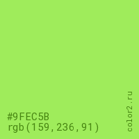 Цвет #9FEC5B в цветовой модели RGB обозначается тремя октетами (159, 236, 91) в десятичном формате и #9FEC5B в шестнадцатиричном (hex) формате, которые являются интенсивностью красного 159 (hex 9F), интенсивность зелёного 236 (hex EC) и интенсивность синего 91 (hex 5B).