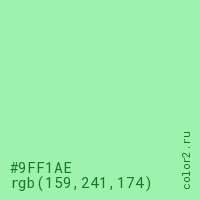 Цвет #9FF1AE в цветовой модели RGB обозначается тремя октетами (159, 241, 174) в десятичном формате и #9FF1AE в шестнадцатиричном (hex) формате, которые являются интенсивностью красного 159 (hex 9F), интенсивность зелёного 241 (hex F1) и интенсивность синего 174 (hex AE).