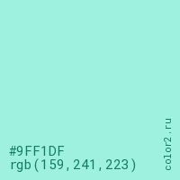Цвет #9FF1DF в цветовой модели RGB обозначается тремя октетами (159, 241, 223) в десятичном формате и #9FF1DF в шестнадцатиричном (hex) формате, которые являются интенсивностью красного 159 (hex 9F), интенсивность зелёного 241 (hex F1) и интенсивность синего 223 (hex DF).