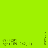 Цвет #9FF201 в цветовой модели RGB обозначается тремя октетами (159, 242, 1) в десятичном формате и #9FF201 в шестнадцатиричном (hex) формате, которые являются интенсивностью красного 159 (hex 9F), интенсивность зелёного 242 (hex F2) и интенсивность синего 1 (hex 01).