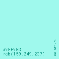 Цвет #9FF9ED в цветовой модели RGB обозначается тремя октетами (159, 249, 237) в десятичном формате и #9FF9ED в шестнадцатиричном (hex) формате, которые являются интенсивностью красного 159 (hex 9F), интенсивность зелёного 249 (hex F9) и интенсивность синего 237 (hex ED).
