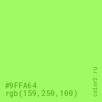 Цвет #9FFA64 в цветовой модели RGB обозначается тремя октетами (159, 250, 100) в десятичном формате и #9FFA64 в шестнадцатиричном (hex) формате, которые являются интенсивностью красного 159 (hex 9F), интенсивность зелёного 250 (hex FA) и интенсивность синего 100 (hex 64).