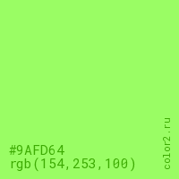 Цвет #9AFD64 в цветовой модели RGB обозначается тремя октетами (154, 253, 100) в десятичном формате и #9AFD64 в шестнадцатиричном (hex) формате, которые являются интенсивностью красного 154 (hex 9A), интенсивность зелёного 253 (hex FD) и интенсивность синего 100 (hex 64).
