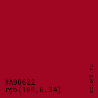 Цвет #A00622 в цветовой модели RGB обозначается тремя октетами (160, 6, 34) в десятичном формате и #A00622 в шестнадцатиричном (hex) формате, которые являются интенсивностью красного 160 (hex A0), интенсивность зелёного 6 (hex 06) и интенсивность синего 34 (hex 22).
