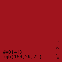 Цвет #A0141D в цветовой модели RGB обозначается тремя октетами (160, 20, 29) в десятичном формате и #A0141D в шестнадцатиричном (hex) формате, которые являются интенсивностью красного 160 (hex A0), интенсивность зелёного 20 (hex 14) и интенсивность синего 29 (hex 1D).