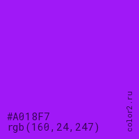 Цвет #A018F7 в цветовой модели RGB обозначается тремя октетами (160, 24, 247) в десятичном формате и #A018F7 в шестнадцатиричном (hex) формате, которые являются интенсивностью красного 160 (hex A0), интенсивность зелёного 24 (hex 18) и интенсивность синего 247 (hex F7).