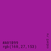 Цвет #A01B99 в цветовой модели RGB обозначается тремя октетами (160, 27, 153) в десятичном формате и #A01B99 в шестнадцатиричном (hex) формате, которые являются интенсивностью красного 160 (hex A0), интенсивность зелёного 27 (hex 1B) и интенсивность синего 153 (hex 99).