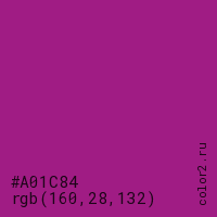Цвет #A01C84 в цветовой модели RGB обозначается тремя октетами (160, 28, 132) в десятичном формате и #A01C84 в шестнадцатиричном (hex) формате, которые являются интенсивностью красного 160 (hex A0), интенсивность зелёного 28 (hex 1C) и интенсивность синего 132 (hex 84).