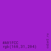 Цвет #A01FCC в цветовой модели RGB обозначается тремя октетами (160, 31, 204) в десятичном формате и #A01FCC в шестнадцатиричном (hex) формате, которые являются интенсивностью красного 160 (hex A0), интенсивность зелёного 31 (hex 1F) и интенсивность синего 204 (hex CC).