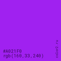 Цвет #A021F0 в цветовой модели RGB обозначается тремя октетами (160, 33, 240) в десятичном формате и #A021F0 в шестнадцатиричном (hex) формате, которые являются интенсивностью красного 160 (hex A0), интенсивность зелёного 33 (hex 21) и интенсивность синего 240 (hex F0).