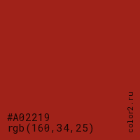 Цвет #A02219 в цветовой модели RGB обозначается тремя октетами (160, 34, 25) в десятичном формате и #A02219 в шестнадцатиричном (hex) формате, которые являются интенсивностью красного 160 (hex A0), интенсивность зелёного 34 (hex 22) и интенсивность синего 25 (hex 19).