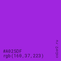 Цвет #A025DF в цветовой модели RGB обозначается тремя октетами (160, 37, 223) в десятичном формате и #A025DF в шестнадцатиричном (hex) формате, которые являются интенсивностью красного 160 (hex A0), интенсивность зелёного 37 (hex 25) и интенсивность синего 223 (hex DF).