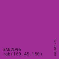 Цвет #A02D96 в цветовой модели RGB обозначается тремя октетами (160, 45, 150) в десятичном формате и #A02D96 в шестнадцатиричном (hex) формате, которые являются интенсивностью красного 160 (hex A0), интенсивность зелёного 45 (hex 2D) и интенсивность синего 150 (hex 96).