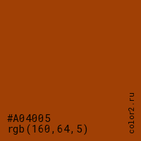 Цвет #A04005 в цветовой модели RGB обозначается тремя октетами (160, 64, 5) в десятичном формате и #A04005 в шестнадцатиричном (hex) формате, которые являются интенсивностью красного 160 (hex A0), интенсивность зелёного 64 (hex 40) и интенсивность синего 5 (hex 05).