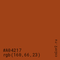 Цвет #A04217 в цветовой модели RGB обозначается тремя октетами (160, 66, 23) в десятичном формате и #A04217 в шестнадцатиричном (hex) формате, которые являются интенсивностью красного 160 (hex A0), интенсивность зелёного 66 (hex 42) и интенсивность синего 23 (hex 17).