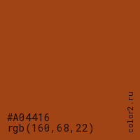 Цвет #A04416 в цветовой модели RGB обозначается тремя октетами (160, 68, 22) в десятичном формате и #A04416 в шестнадцатиричном (hex) формате, которые являются интенсивностью красного 160 (hex A0), интенсивность зелёного 68 (hex 44) и интенсивность синего 22 (hex 16).