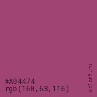 Цвет #A04474 в цветовой модели RGB обозначается тремя октетами (160, 68, 116) в десятичном формате и #A04474 в шестнадцатиричном (hex) формате, которые являются интенсивностью красного 160 (hex A0), интенсивность зелёного 68 (hex 44) и интенсивность синего 116 (hex 74).