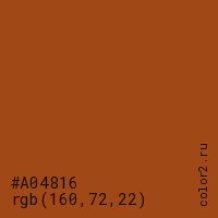 Цвет #A04816 в цветовой модели RGB обозначается тремя октетами (160, 72, 22) в десятичном формате и #A04816 в шестнадцатиричном (hex) формате, которые являются интенсивностью красного 160 (hex A0), интенсивность зелёного 72 (hex 48) и интенсивность синего 22 (hex 16).
