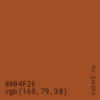 Цвет #A04F26 в цветовой модели RGB обозначается тремя октетами (160, 79, 38) в десятичном формате и #A04F26 в шестнадцатиричном (hex) формате, которые являются интенсивностью красного 160 (hex A0), интенсивность зелёного 79 (hex 4F) и интенсивность синего 38 (hex 26).