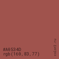 Цвет #A0534D в цветовой модели RGB обозначается тремя октетами (160, 83, 77) в десятичном формате и #A0534D в шестнадцатиричном (hex) формате, которые являются интенсивностью красного 160 (hex A0), интенсивность зелёного 83 (hex 53) и интенсивность синего 77 (hex 4D).