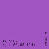 Цвет #A055C2 в цветовой модели RGB обозначается тремя октетами (160, 85, 194) в десятичном формате и #A055C2 в шестнадцатиричном (hex) формате, которые являются интенсивностью красного 160 (hex A0), интенсивность зелёного 85 (hex 55) и интенсивность синего 194 (hex C2).