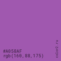 Цвет #A058AF в цветовой модели RGB обозначается тремя октетами (160, 88, 175) в десятичном формате и #A058AF в шестнадцатиричном (hex) формате, которые являются интенсивностью красного 160 (hex A0), интенсивность зелёного 88 (hex 58) и интенсивность синего 175 (hex AF).