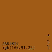 Цвет #A05B16 в цветовой модели RGB обозначается тремя октетами (160, 91, 22) в десятичном формате и #A05B16 в шестнадцатиричном (hex) формате, которые являются интенсивностью красного 160 (hex A0), интенсивность зелёного 91 (hex 5B) и интенсивность синего 22 (hex 16).