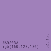 Цвет #A080BA в цветовой модели RGB обозначается тремя октетами (160, 128, 186) в десятичном формате и #A080BA в шестнадцатиричном (hex) формате, которые являются интенсивностью красного 160 (hex A0), интенсивность зелёного 128 (hex 80) и интенсивность синего 186 (hex BA).