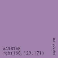 Цвет #A081AB в цветовой модели RGB обозначается тремя октетами (160, 129, 171) в десятичном формате и #A081AB в шестнадцатиричном (hex) формате, которые являются интенсивностью красного 160 (hex A0), интенсивность зелёного 129 (hex 81) и интенсивность синего 171 (hex AB).