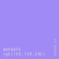 Цвет #A08AF6 в цветовой модели RGB обозначается тремя октетами (160, 138, 246) в десятичном формате и #A08AF6 в шестнадцатиричном (hex) формате, которые являются интенсивностью красного 160 (hex A0), интенсивность зелёного 138 (hex 8A) и интенсивность синего 246 (hex F6).
