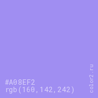 Цвет #A08EF2 в цветовой модели RGB обозначается тремя октетами (160, 142, 242) в десятичном формате и #A08EF2 в шестнадцатиричном (hex) формате, которые являются интенсивностью красного 160 (hex A0), интенсивность зелёного 142 (hex 8E) и интенсивность синего 242 (hex F2).