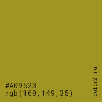Цвет #A09523 в цветовой модели RGB обозначается тремя октетами (160, 149, 35) в десятичном формате и #A09523 в шестнадцатиричном (hex) формате, которые являются интенсивностью красного 160 (hex A0), интенсивность зелёного 149 (hex 95) и интенсивность синего 35 (hex 23).