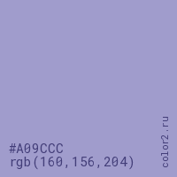 Цвет #A09CCC в цветовой модели RGB обозначается тремя октетами (160, 156, 204) в десятичном формате и #A09CCC в шестнадцатиричном (hex) формате, которые являются интенсивностью красного 160 (hex A0), интенсивность зелёного 156 (hex 9C) и интенсивность синего 204 (hex CC).